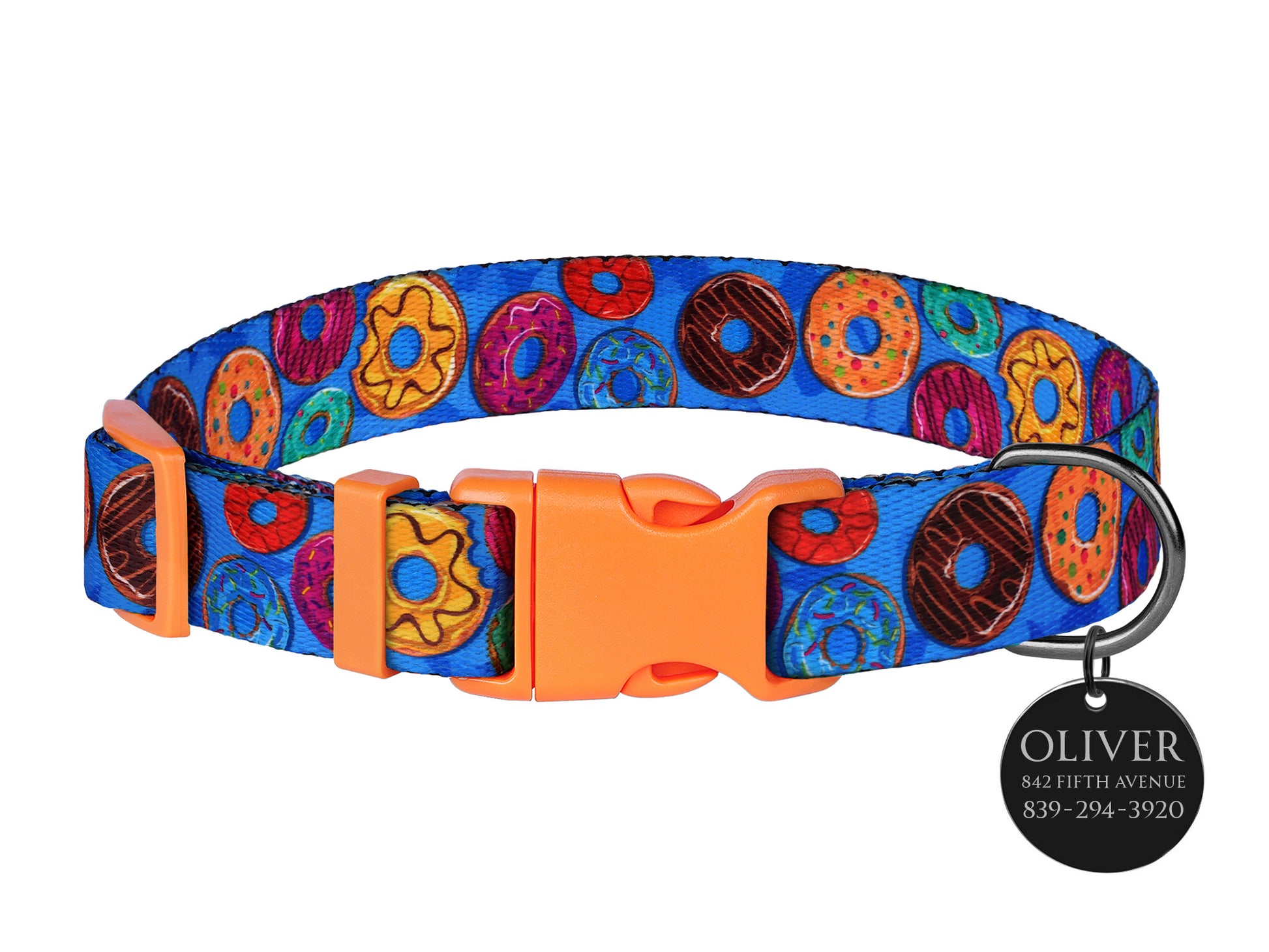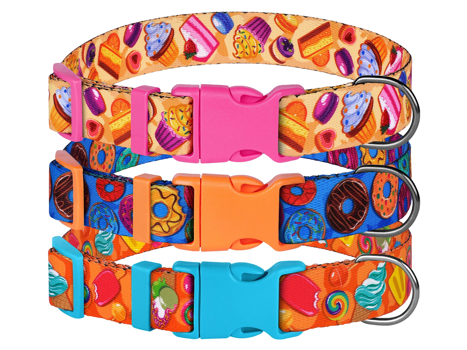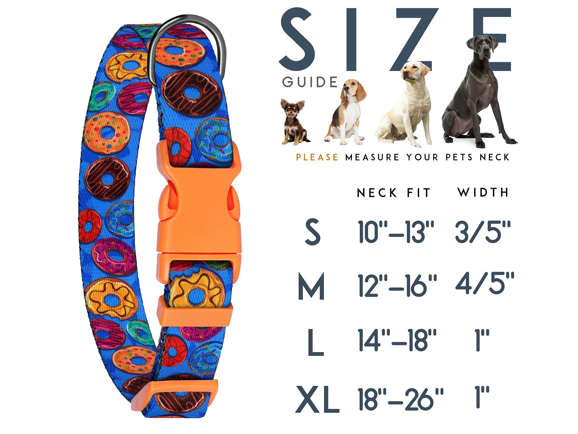 This dog collar is made of print nylon. Our adjustable dog collar combines comfort and unique vibrant design. It is a durable, soft and comfortable dog collar. This pattern dog collar is suitable for small, medium and large breeds.